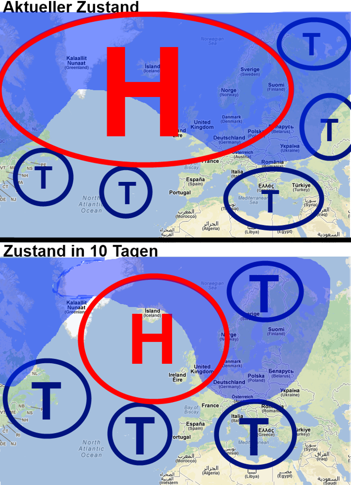 Zur Verdeutlichung noch folgende Grafik, die die groben Drucktendenzen in 8 bis 10 Tagen darstellt: